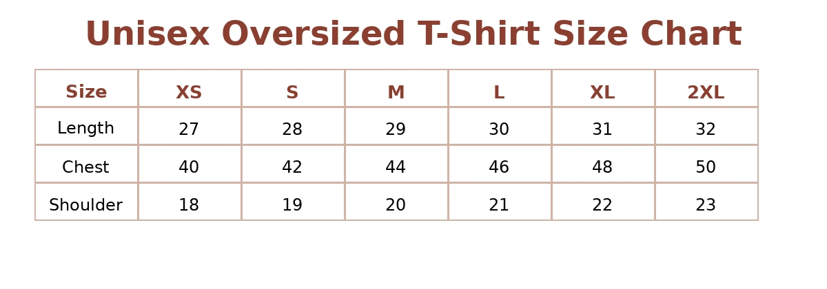 Oversized Tshirt XS S M L XL XXL Chest (inches) 40 42 44 46 48 50 Length (inches) 27 28 29 30 31 32 Shoulder (inches) 18 19 20 21 22 23 Returns Policy
